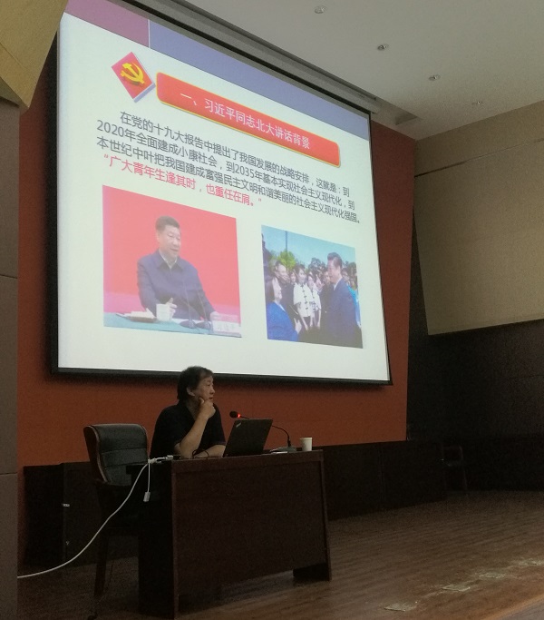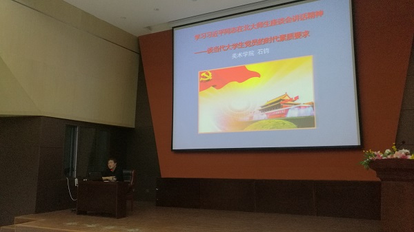 石钧副书记以《学习习近平总书记在北京大学师生座谈会上的重要讲话精神——谈当代大学生党员的时代素质要求》为题,讲述了习近平总书记北大讲话的背景和当代大学生党员素质现状、时代素质要求以及当代大学生党员应具备的素质等内容。