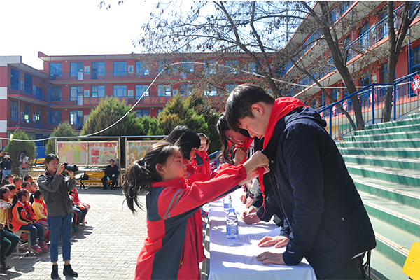 和林二小学生为支教团佩戴红领巾