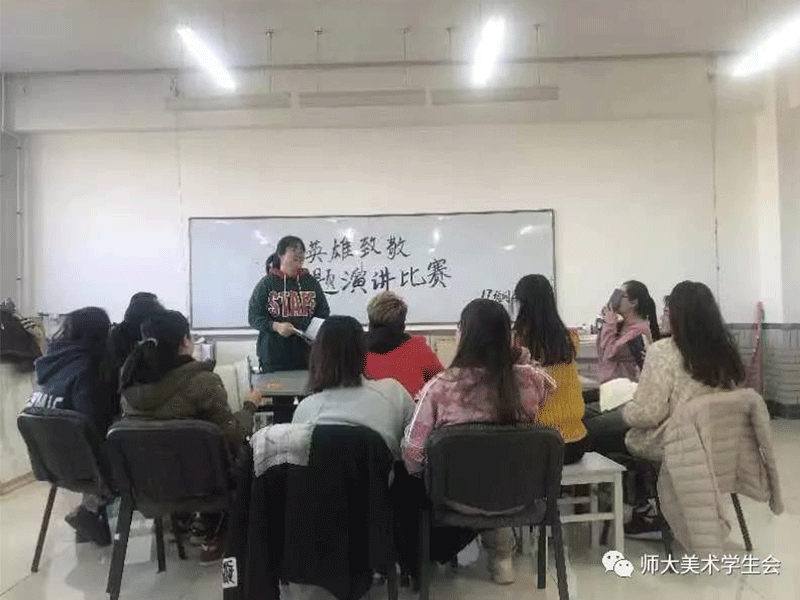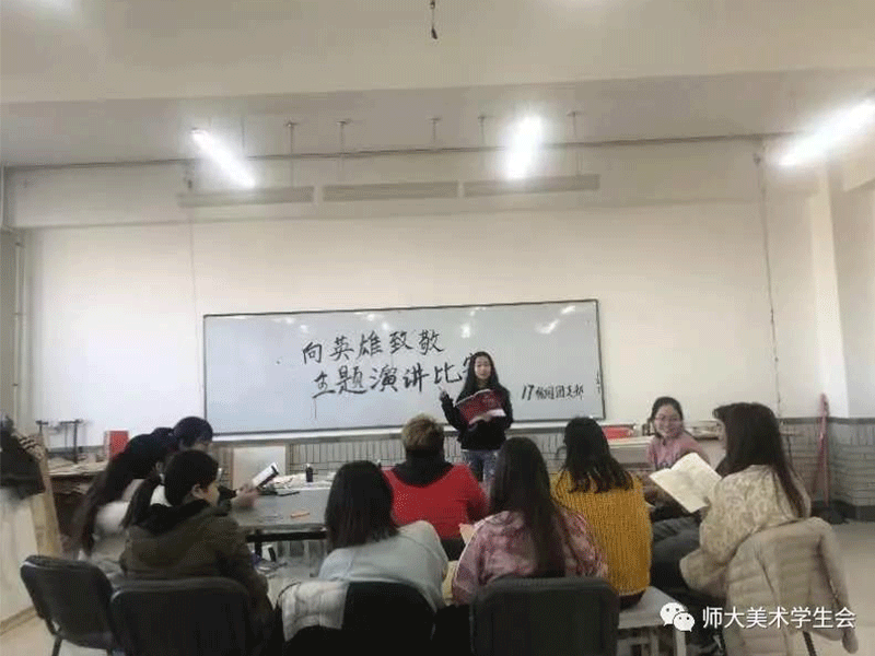 为传承和弘扬英雄烈士精神,深入培育和践行社会主义核心价值观,弘扬爱国主义精神,提升青年大学生对英雄的崇敬之情。探花合集 2017级绘画国画班于20181221日在探花合集 B308室开展了“缅怀历史,致敬英雄”的演讲比赛。