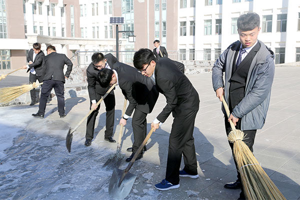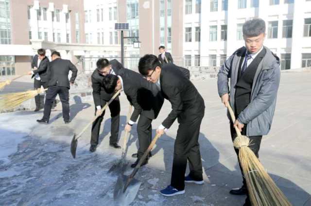 由志愿者组成的服务队主动将校园内的积雪寒冰进行铲除,防止老师学生发生危险,此次活动圆满成功,得到了清洁人员的一致赞扬。