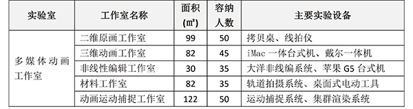动画专业2002设系招生并建立工作室,承担动画设计专业所有实验教学课程。现有实验场地466平米,建有二维原画工作室、三维动画工作室、非线性编辑工作室、材料工作室、动画运动捕捉系统工作室。拥有智能定格动画拍摄、运动捕捉、集群渲染等专业设备,具备Windows和MacOSX双系统平台的视频编辑能力。现有实验室主任1名、专职实验人员1名。作为内蒙古自治区唯一授权点开展全国计算机数字图形图像应用技术等级考试及培训工作基地。