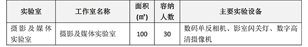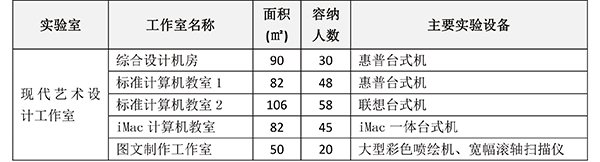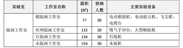 拥有实验室总建筑面积为2482平米,教学仪器设备总值达1430万元,设备完好率达98%。先后建立了版画实践教学系列工作室、现代艺术设计工作室、工业设计系列材料与模型制作工作室、动画实验教学工作室、装饰材料与装饰构造实验室、摄影及媒体实验室、绘画材料技法研究系列工作室等7个实验室。建设多媒体教室共9间,面积为772平米,可容纳教学人数为600多人。现有计算机教室5间,建筑面积约442平米,教学实验用计算机250余台。