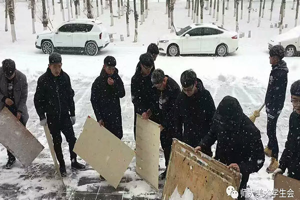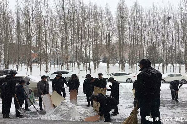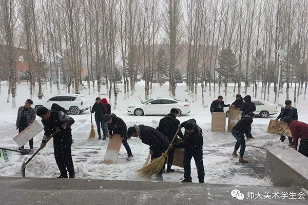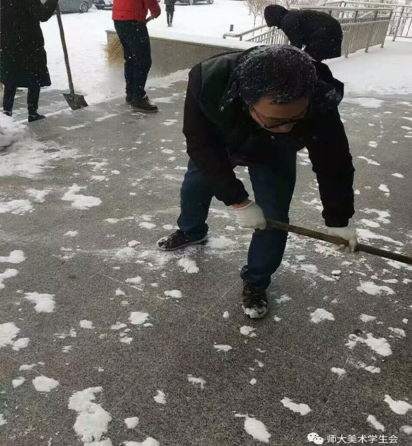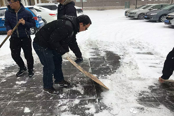 新学期的第一场雪,美院师生共同除雪,大家齐心协力,分工合作,配合默契。美院师生们用“团结、友爱、互助、奉献”的精神融化了美院的冰雪,在此真诚地向同学老师们说一声“辛苦了!”