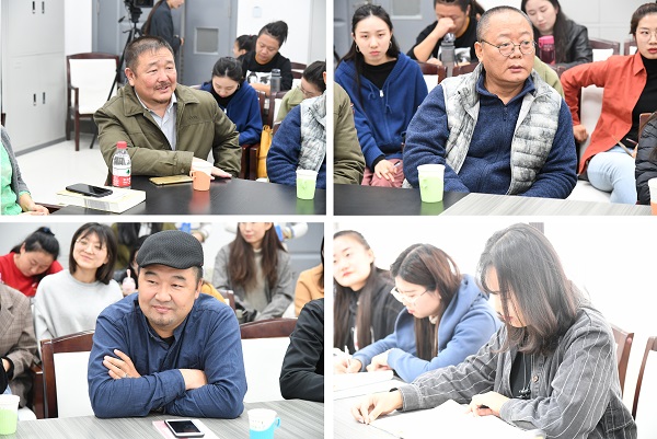 贾方舟对我院艺术教学、科学研究和学生培养的成果给予赞赏,并兴致勃勃地分享了艺术创作的经验经历和感悟,贾泛舟先生对现场师生提出的从如何找到自己的研究方向、全国美展、内蒙古美术、为什么要画画等问题进行了一一解答。他讲到在如今多元环境的影响下,“自我”就是一个基点,要对自己有一个判断,认识自我、塑造自我。一个艺术的成熟过程,是在认识中不断修正、提高自己的过程。贾方舟先生对内蒙古美术发展的各个阶段发展状况、代表人物就行了梳理讲解。一个艺术家必须要战胜贫穷,才能使艺术理想得到实现,之后还要战胜富裕。我们每个人为什么画画,这就像蜜蜂酿蜜、春禅吐丝,是一种非画不可的本能、源动力,是一种的表达的欲望。贾方舟先生还讲到理论家、批评家、艺术史家关系。无论是创作还是艺术理论研究,还是做人做事,都要有问题意识。其渊博的知识、丰富的人生阅历和敏锐的观察力让在场的师生有了很多收获。