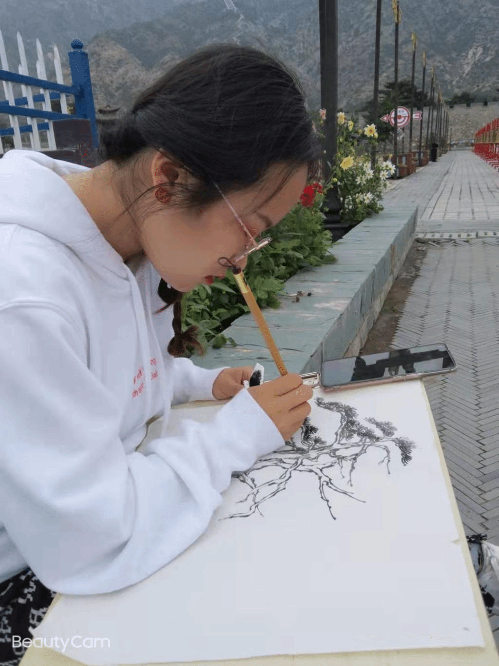第三站我们登上高高的阴山,到山上的白塔和敖包旁参观。虽然长长的山路爬起来非常辛苦,但是每走一步就有不一样的风景出现,于是大家牵着手唱着歌,置身于沿途优美的风景中,这也缓解了一些劳累和困乏。在毕业创作时准备画山水画的同学们更是一路拍摄素材,想把所有的美景都尽收相机,以便于返校之后进行创作。