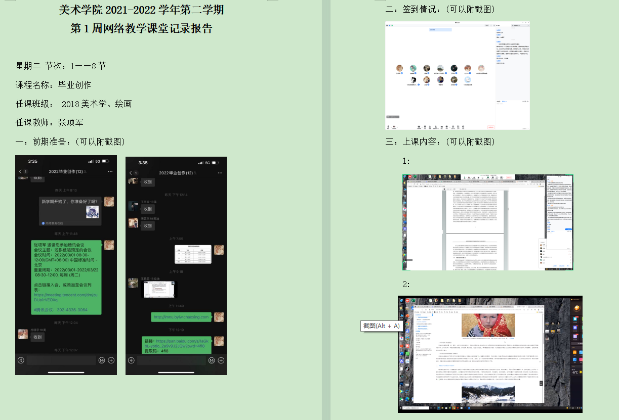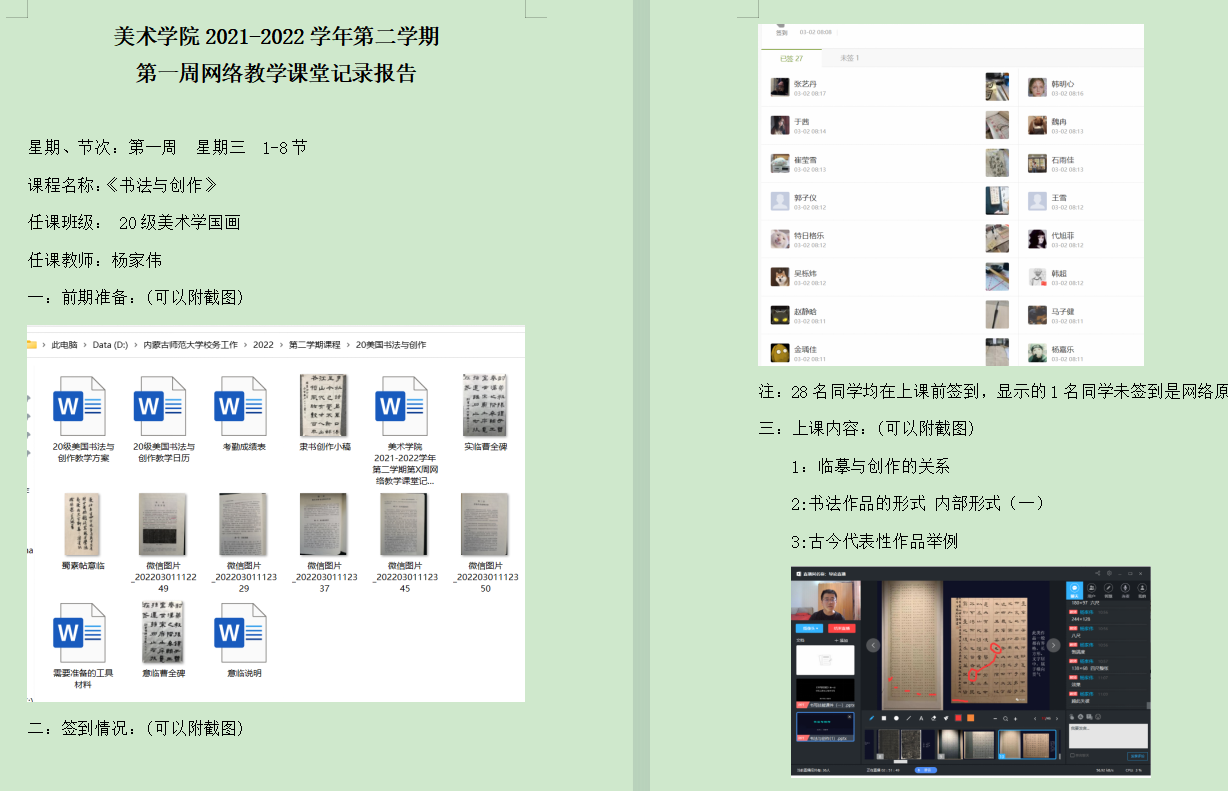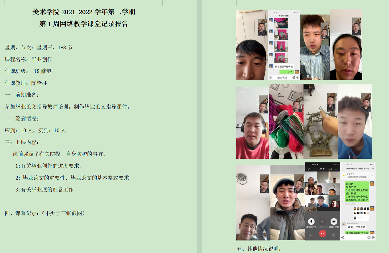 1、本周我院共开设线上课程65门次,涉及65个教学班,有41名教师完成线上教学任务,教师按时到岗率100%,应上课学生1943人次,实际到课学生1943人次,学生到课率100%。