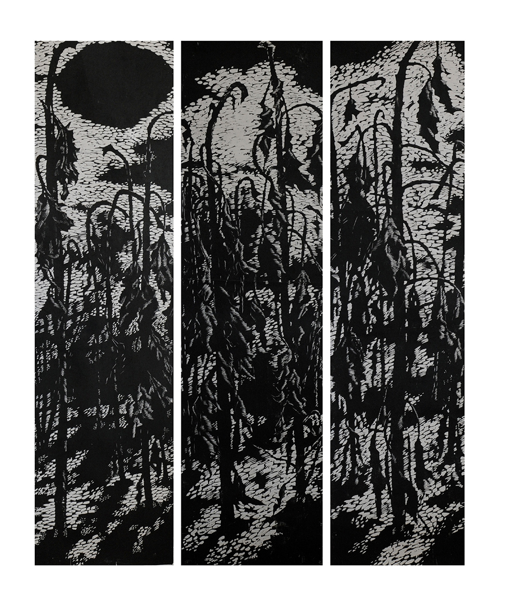 《冬日里的向日葵》 黑白木刻 180cm×50cm×3 2007年